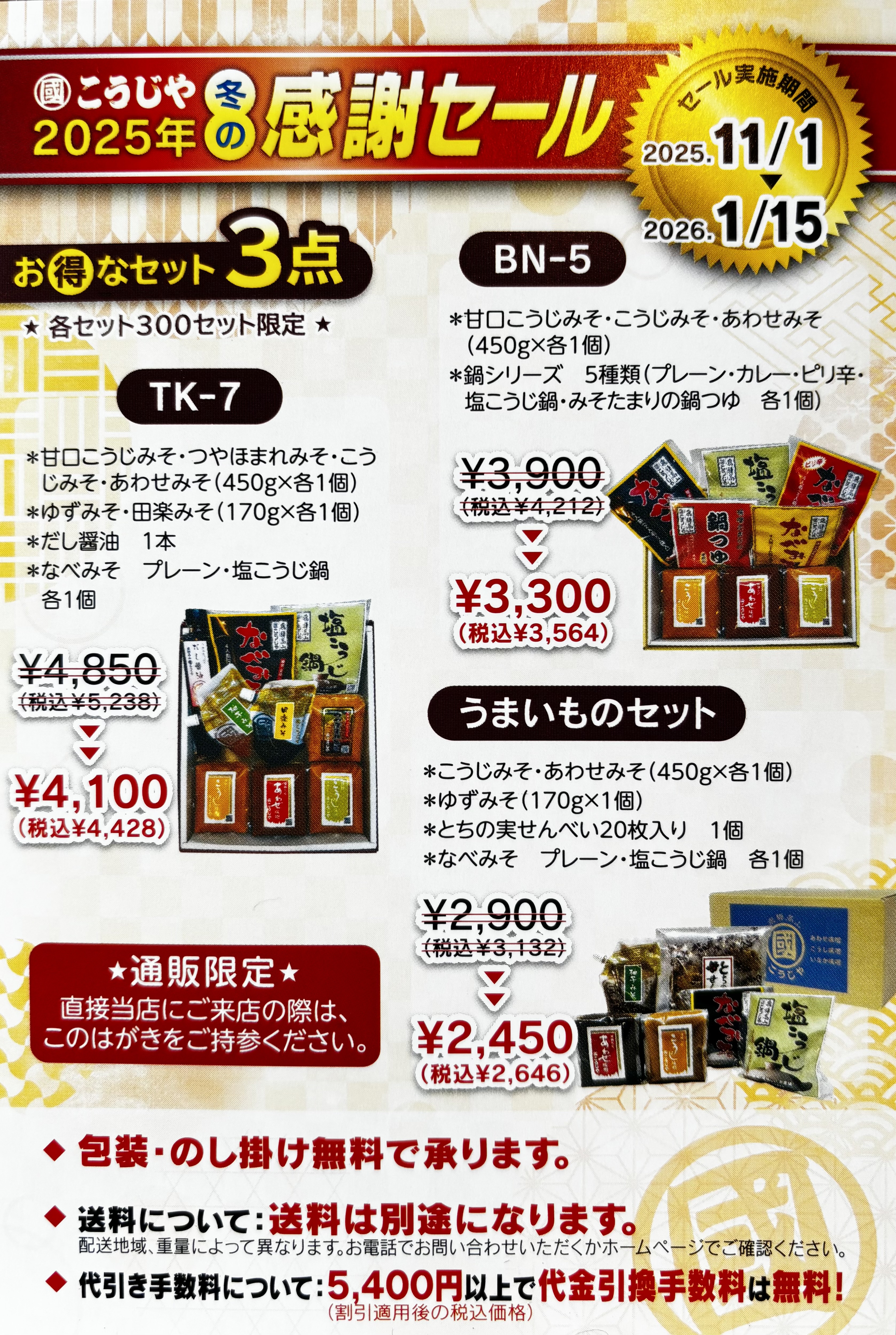 ~2026/1/15まで、こうじや柴田 冬の感謝セールを開催します