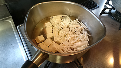 - だし汁があたたまりかけたら、豆腐とえのき茸を入れてさっと煮る。